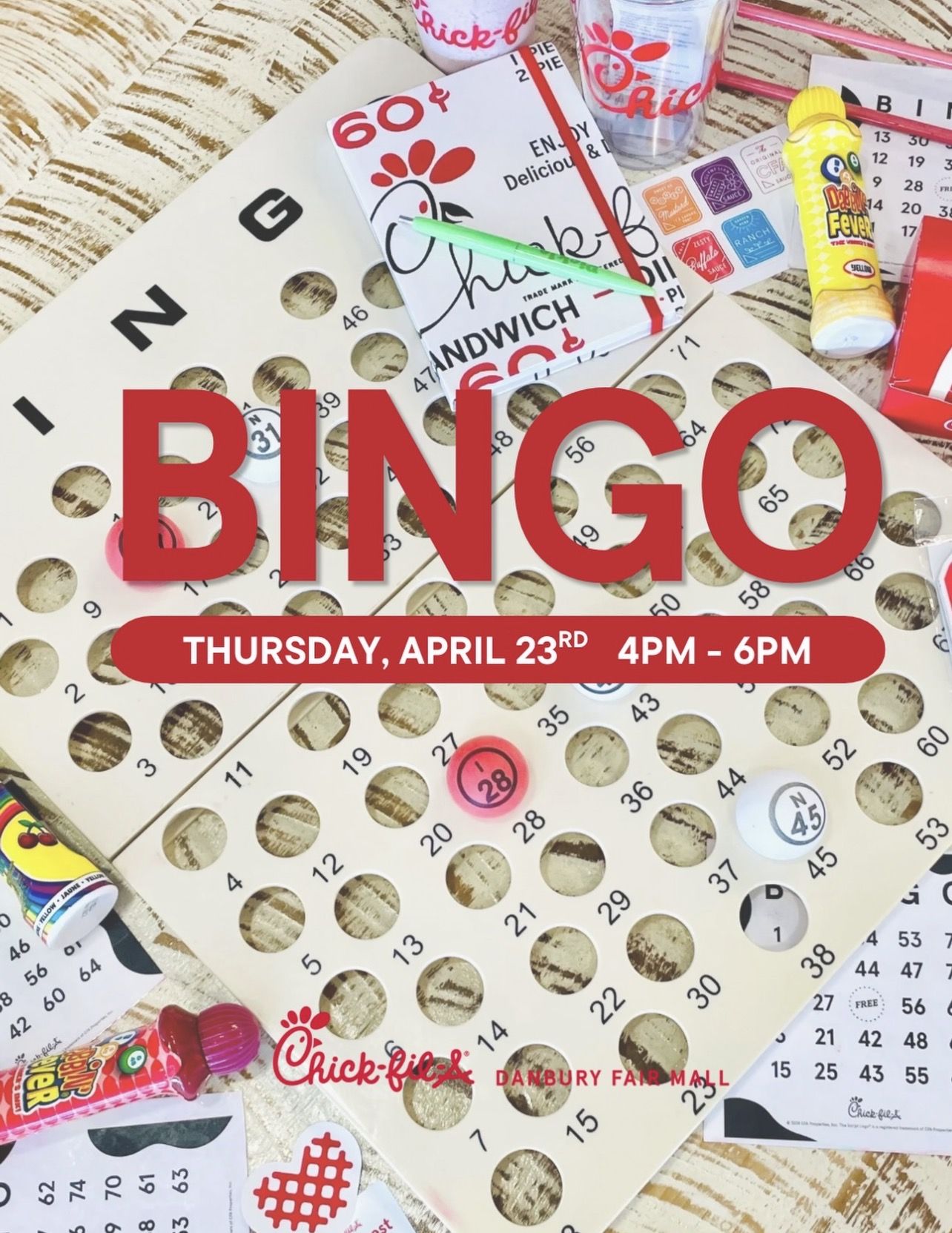 When you dine with us, receive a bingo card and head over in front of Chick-fil-A Danbury Fair Mall to play Bingo, win prizes, and enjoy a great time with family and friends!